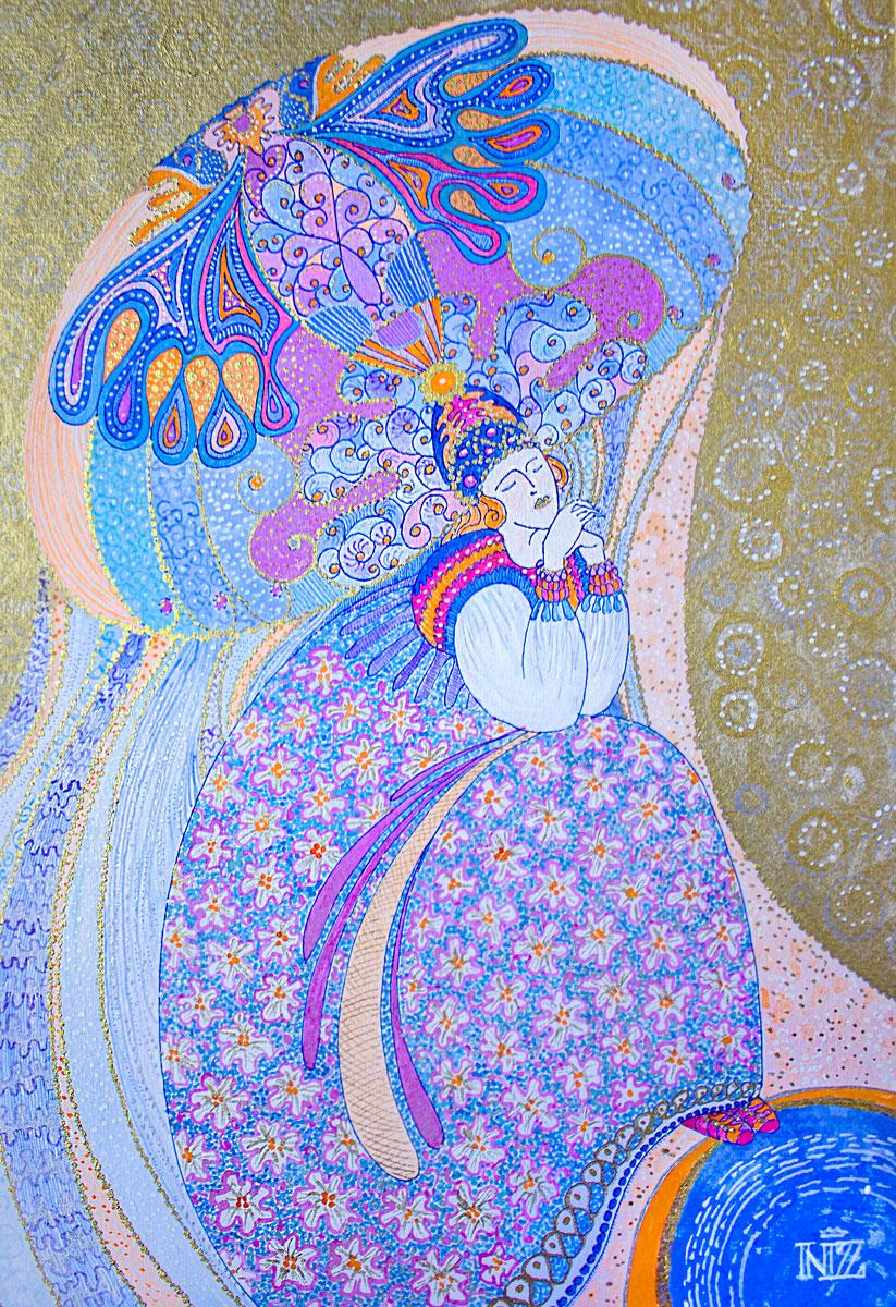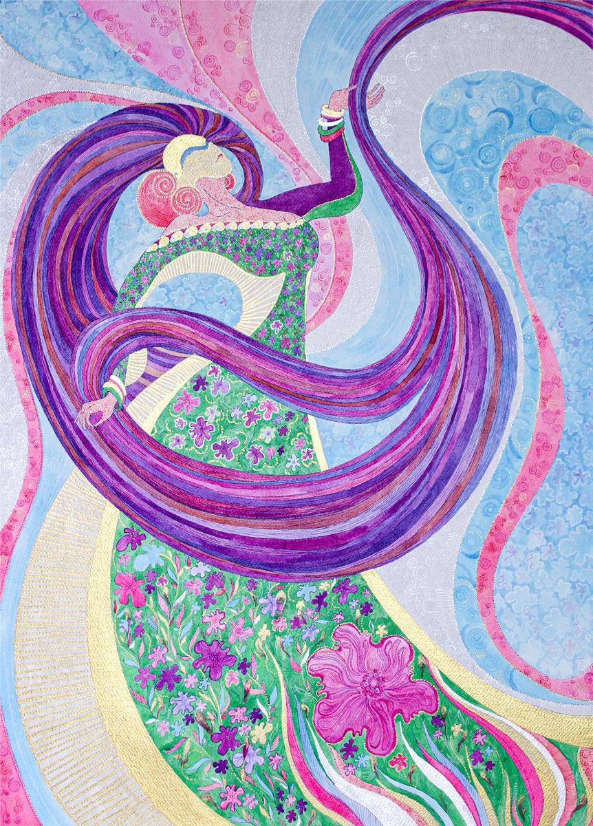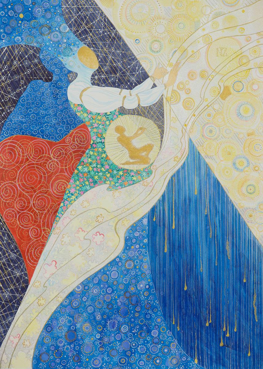 Her skirt blooms with floral symbols, orbits of joy, and ancient embroidery motifs, while her outstretched wings seem to cast blessings upon the world.