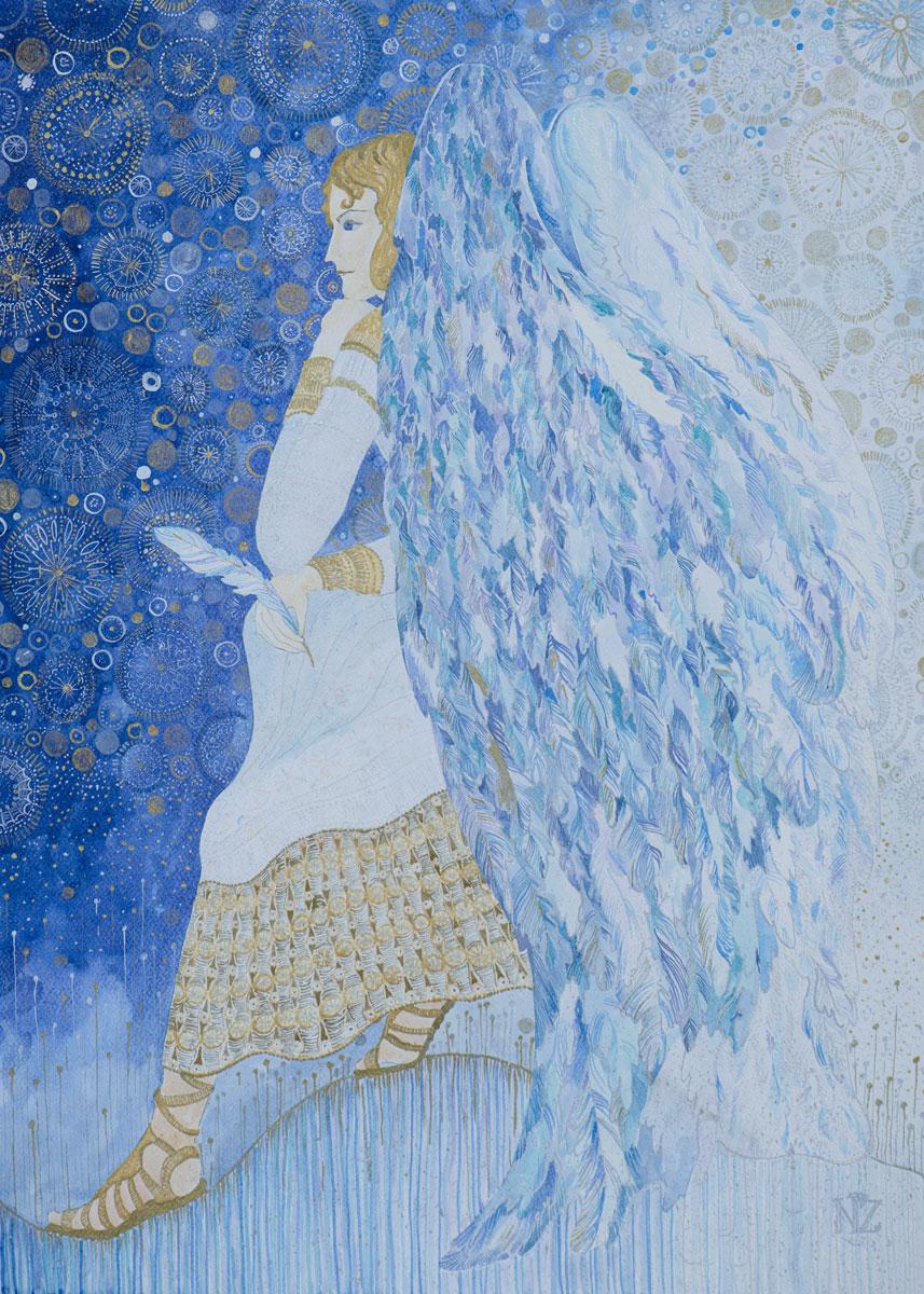 This painting evokes serenity, divine presence, and the mystery of messengers who walk between worlds.