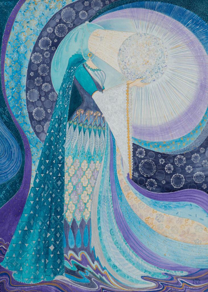 Donna di Luce — she who carries the moon in her hands and pours light like water. Draped in a tapestry of turquoise, lavender, and silver, she emerges from a dimension where silence has shape and radiance breathes. Her form is not only a figure but a celestial equation — flowing, layered, resonant.