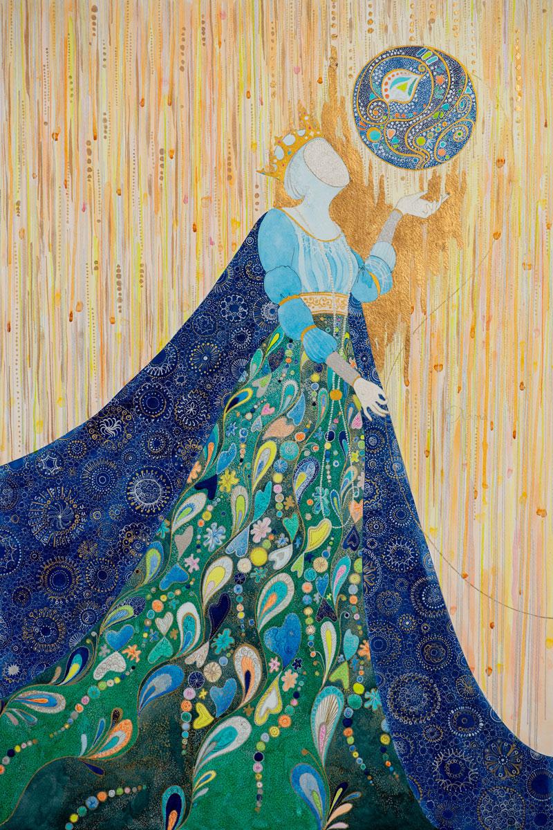 The figure at the centre of the composition is not acting and does not tell a story. She exists in a state of attunement — aligned with both inner and outer space. Concentric forms expand around her like waves, breath, or a heartbeat. The surrounding field responds, vibrates, and moves together with her presence.